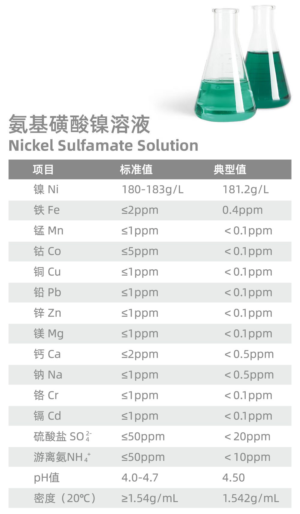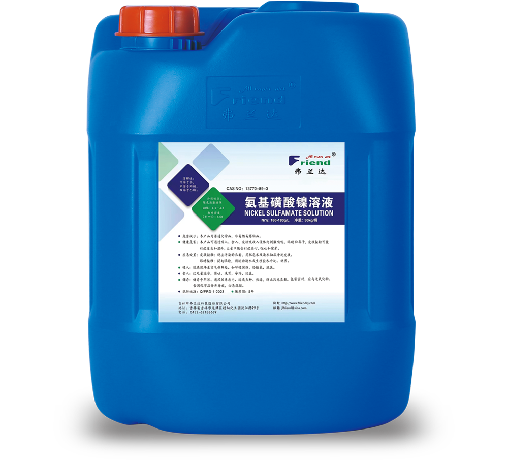 氨基磺酸鎳溶液(Nickel Sulfamate Solution) 分 子式:Ni(NH2SO3)2 分子量:250.87 性 狀:深綠色透明液體。 用 途:主要用于精密電鍍、電鑄、電子工業(yè)等。 包 裝:HDPE桶裝,每桶30公斤。 儲(chǔ) 運(yùn):運(yùn)輸時(shí)包裝要密封,運(yùn)輸過程中防止受熱,貯存在陰涼,通風(fēng)處。